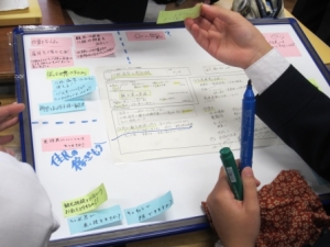 先生:「まず5分間で、貰った付箋の分類をして、自分なりのアドバイスを考えてください。次に、小集団で話し合って提案内容の再検討をしてください。結論はホワイトボードに書いてください。(10分間)」