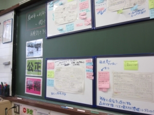 先生:「この3つが今日の視点です。では5分間。発表者は提案の根拠を大事にしてください。聞く人は付箋に気づいたことを書いて、発表者に渡してあげてください。効率は青の付箋、公正は緑、幸福は赤に書いてください。」(付箋、ホワイトボード、タブレット端末配布。生徒は移動。)